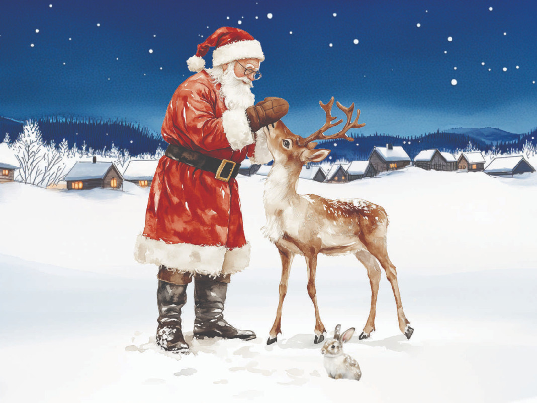 Az éj leple alatt, amikor mindenki aludt, a Mikulást elrepítették a rénszarvasok az emberek világába. Csendben, titokban elrejtette a cipőcskékbe és csizmácskákba a meglepetéseket, és közben mosolyogva gondolt arra, hogy egyik gyerek sem tudhatja, hogy vajon nem ő kapta-e a különleges, madárlátta csomagot.